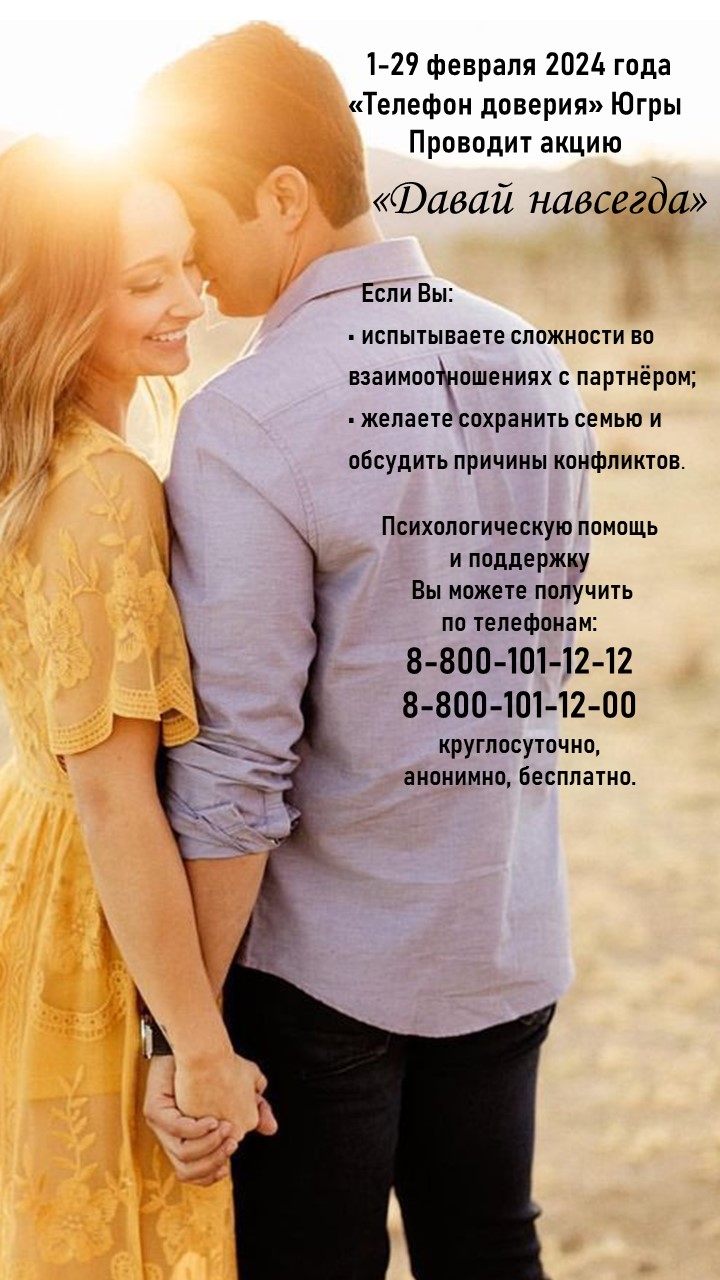 С 1 февраля Единая социально-психологическая служба «Телефон доверия» в Ханты-Мансийском автономном округе – Югре проводит акцию по профилактике разводов «Давай навсегда».