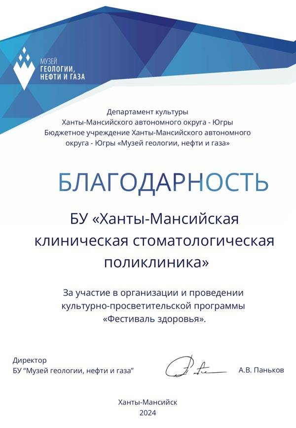 Коллектив Бюджетного учреждения Ханты-Мансийского автономного округа-Югры "Музей геологии, нефти и газа" выразил нам благодарность за участие в недавно состоявшейся культурно-просветительской программе "Фестиваль здоровья".