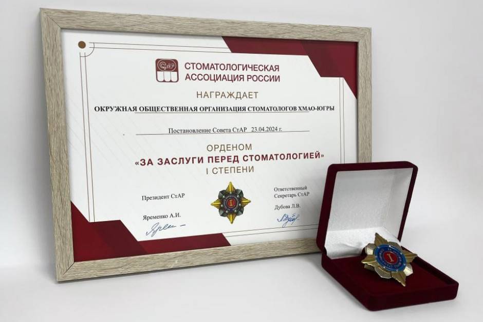 За вклад в развитие стоматологической службы РФ Окружная общественная организация стоматологов ХМАО-Югры награждена орденом Стоматологической Ассоциации России «За заслуги перед стоматологией I степени»