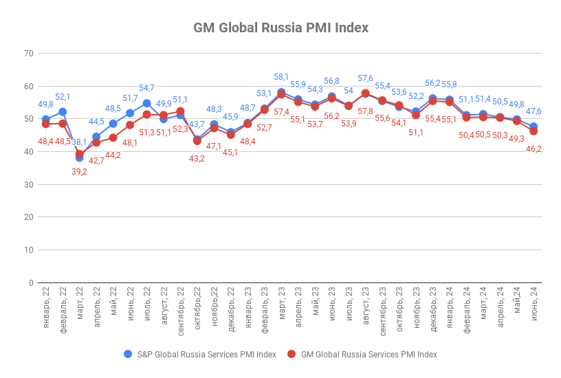 Июньское значение индекса деловой активности ГлобалМедиа PMI (GM Global Services Russia PMI Index) составило 46,2 п.п. против 49,3 п.п. в мае. Значение индекса деловой активности в сфере услуг от S&P Global (Global Russia Services PMI by the S&P Global) за аналогичный период снизилось с 49,8 п.п. до 47,6 п.п.
