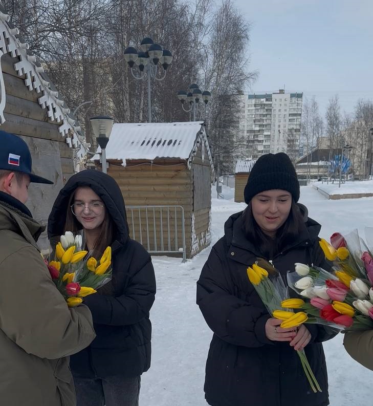 Активисты молодежной организации ЛДПР ХМАО-Югры несут тепло и радость прекрасным дамам, озаряя улицы яркими бутонами тюльпанов