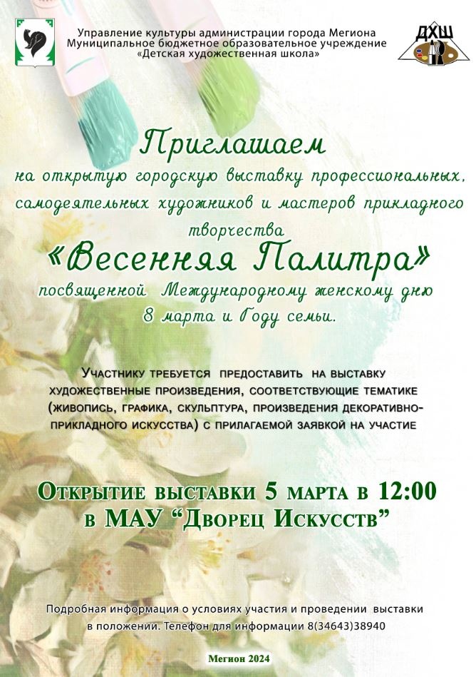 5 марта в Мегионе состоится открытие городской выставки профессиональных и самодеятельных художников и мастеров прикладного творчества «Весенняя палитра-2024»!