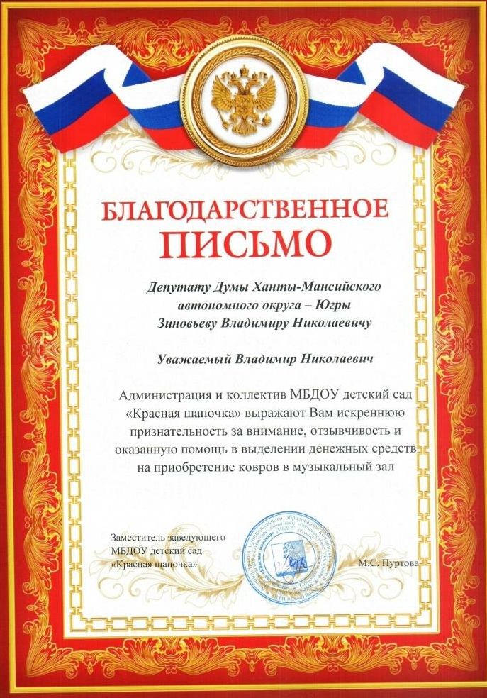 Администрация и коллектив детского сада «Красная шапочка» поселка городского типа Междуреченский Кондинского района поблагодарили за помощь депутата Думы автономного округа, лидера фракции «Российской партии пенсионеров за социальную справедливость» Владимира Зиновьева и выразили надежду на дальнейшее плодотворное сотрудничество.